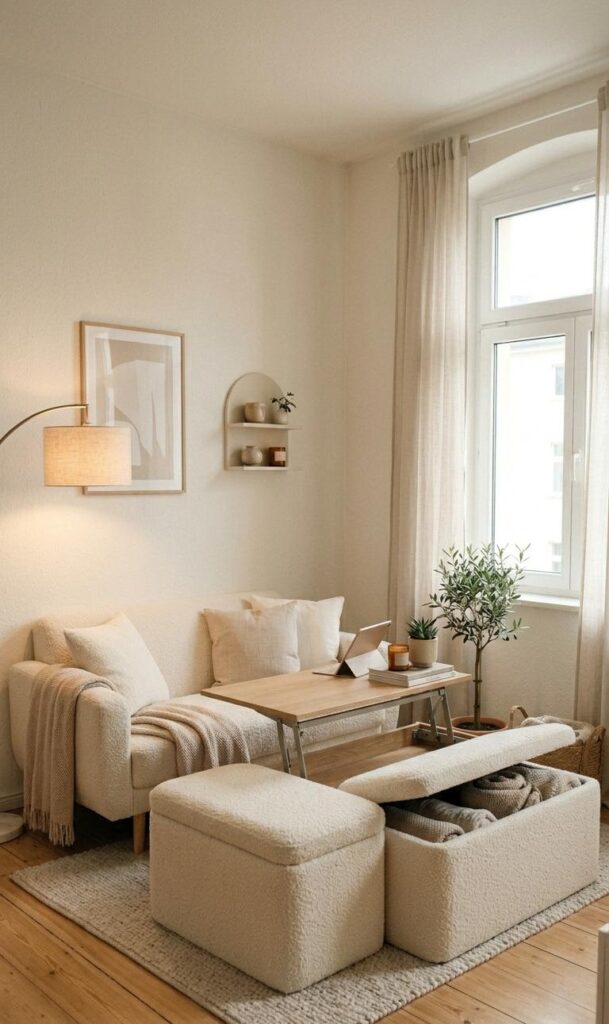 Incorporating multi-functional furniture is one of the smartest small space living strategies for maximizing both style and utility. Opt for pieces like storage ottomans, foldable tables, or sofa beds that offer hidden storage and flexibility. These furniture items reduce clutter while adding practicality, making your small living room decor ideas more efficient and modern. A coffee table with drawers or a bench with storage compartments can help keep your space organized without compromising aesthetics. This approach not only saves space but also enhances comfort and usability. By choosing versatile furniture, you can easily transform your living area to suit different needs, from relaxing to entertaining, while maintaining a chic and cozy living room design.