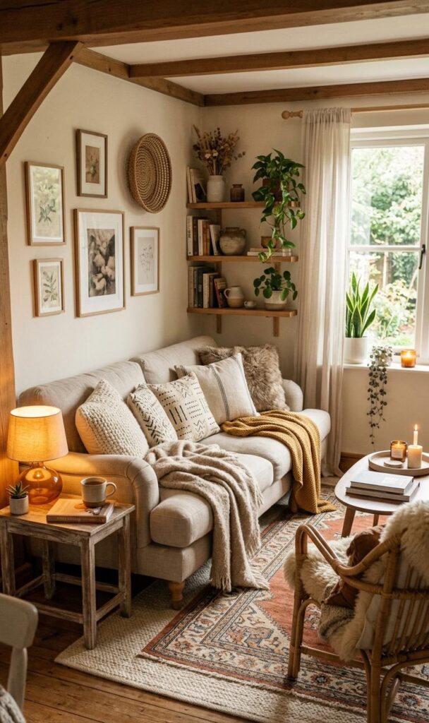 Adding plants is a simple yet effective way to enhance your cozy living room with freshness and life. Indoor plants improve air quality while bringing natural beauty into your space. Choose compact plants like succulents or hanging greenery that fit perfectly into your small living room decor ideas. Placing plants on shelves, windowsills, or corners adds depth without cluttering the room. The greenery creates a calming environment, making your living space feel more inviting and vibrant. Combining plants with neutral decor enhances the overall aesthetic, giving your room a balanced and refreshing look. This nature-inspired touch is perfect for achieving a trendy and relaxing small space living atmosphere.
