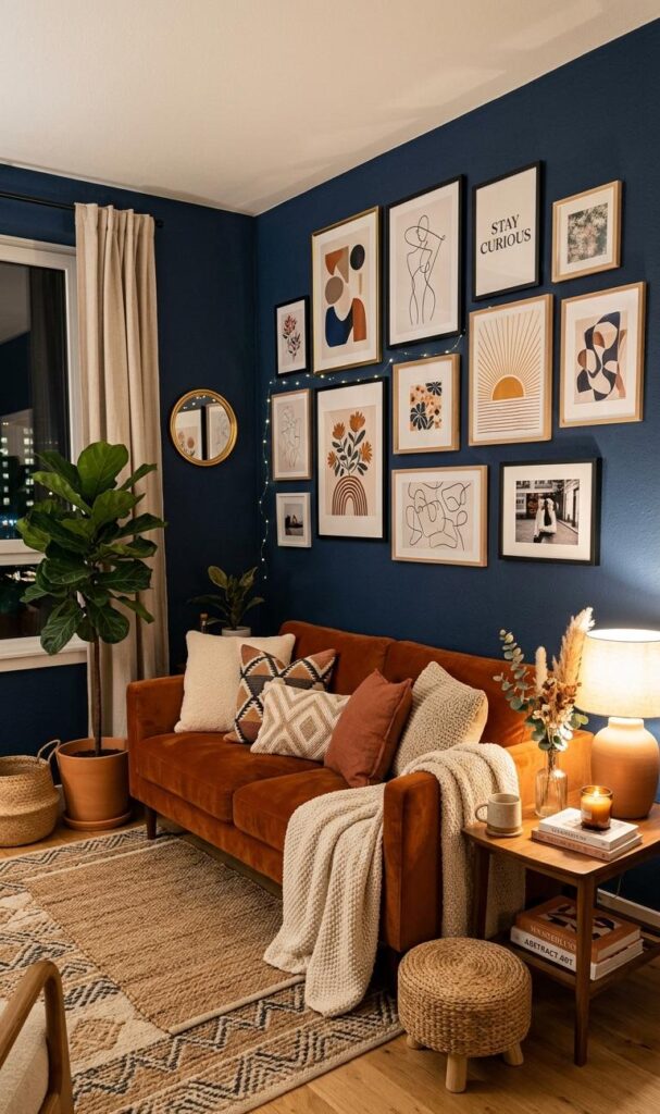 Statement wall art can instantly elevate your living room decor while adding personality to a small space. Choose one bold piece or create a curated gallery wall that reflects your style. Keeping the artwork cohesive in color and theme ensures your small living room decor ideas remain visually balanced. Wall art draws attention upward, making the room feel taller and more spacious. This approach allows you to decorate without taking up valuable floor space. Whether you prefer abstract prints, photography, or modern illustrations, statement art adds a stylish focal point. It’s a simple yet impactful way to transform your living room into a trendy and cozy small living room that feels uniquely yours.