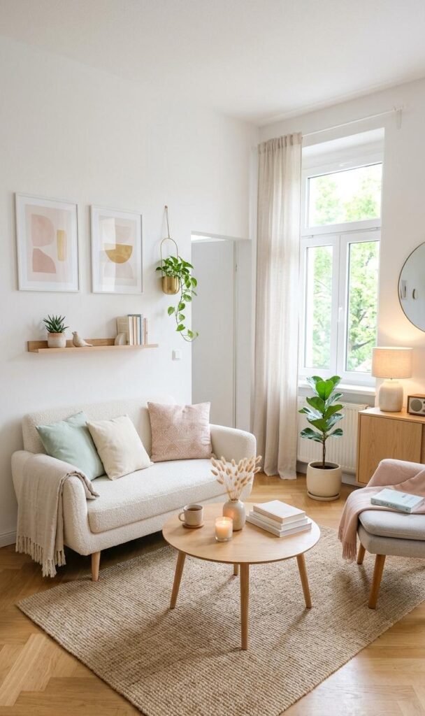 Light colors play a crucial role in creating an airy and open small space aesthetic. Shades like white, beige, and soft pastels reflect light and make your room appear larger. Incorporating these tones into your small living room decor ideas helps maintain a clean and calming environment. Pair light walls with matching furniture and subtle accents for a cohesive look. Adding a few contrasting elements prevents the space from feeling too plain while maintaining balance. This color strategy enhances brightness and creates a soothing atmosphere perfect for relaxation. A well-planned palette ensures your cozy living room design feels modern, elegant, and visually spacious despite limited square footage.