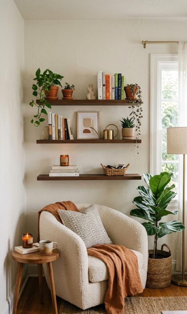 Floating shelves are perfect for maximizing vertical space in small space living. They provide storage without taking up floor area, making them ideal for compact rooms. Use them to display books, decor items, or plants that enhance your small living room decor ideas. Keeping shelves organized and minimal prevents the space from feeling cluttered. This solution adds both functionality and style while maintaining an open layout. Floating shelves also allow you to personalize your living room without overcrowding it. By utilizing vertical space effectively, you can create a stylish and practical cozy living room design that feels modern and spacious.