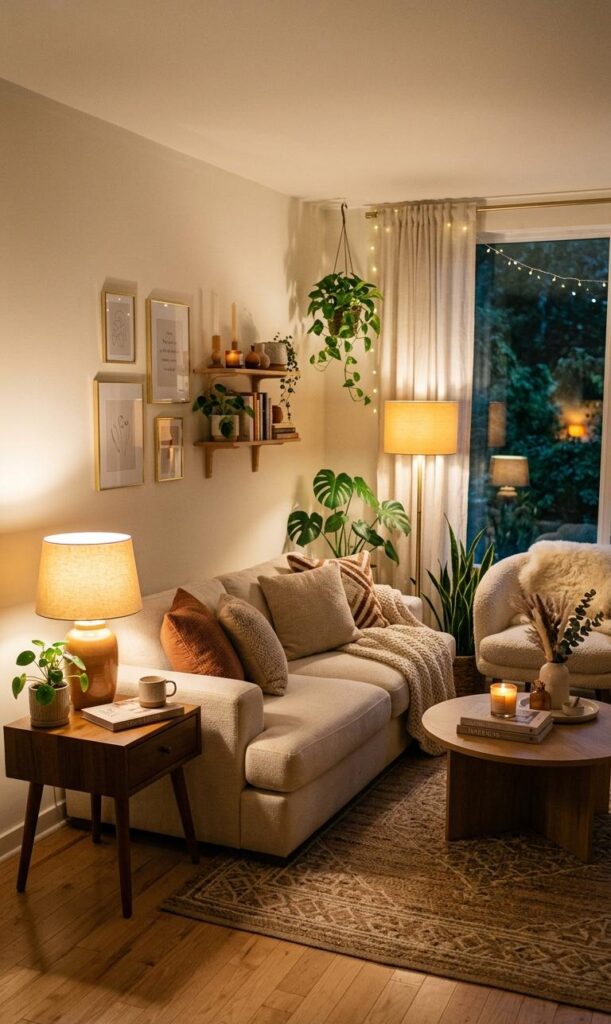 Soft lighting plays a vital role in creating a relaxing cozy living room atmosphere. Use table lamps, floor lamps, or warm LED lights to add a gentle glow. Layering different light sources enhances your small living room decor ideas by adding depth and warmth. Avoid harsh lighting, as it can make the space feel smaller and less inviting. Instead, focus on warm tones that create a soothing ambiance perfect for unwinding. Lighting can also highlight key decor elements, making your room feel thoughtfully designed. This approach ensures your living space remains comfortable, stylish, and ideal for everyday living.