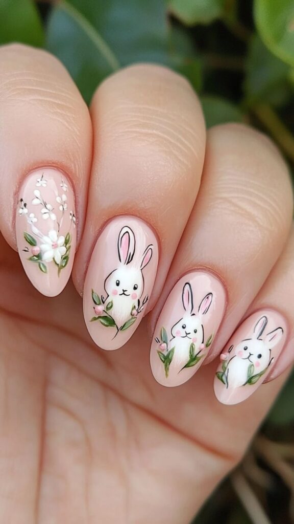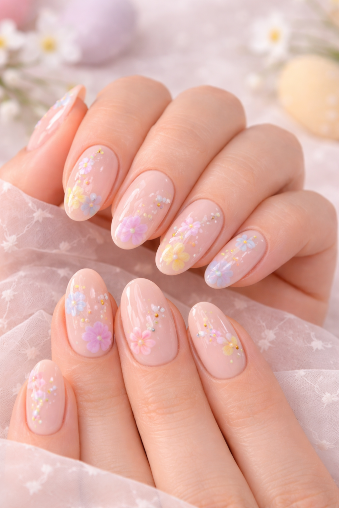 Nothing says spring like blooming flowers, and floral nails are a timeless choice for Easter. Delicate hand-painted daisies, roses, or tulips on a nude or pastel base create a fresh and elegant look. This design embraces the beauty of nature while keeping your manicure soft and feminine. You can mix different flower patterns or stick to a single floral style for a cleaner finish. Adding tiny rhinestones or gold foil can elevate the overall aesthetic. These spring nail designs are perfect for weddings, parties, or everyday wear during the season. If you love romantic styles, this Easter manicure will definitely stand out.