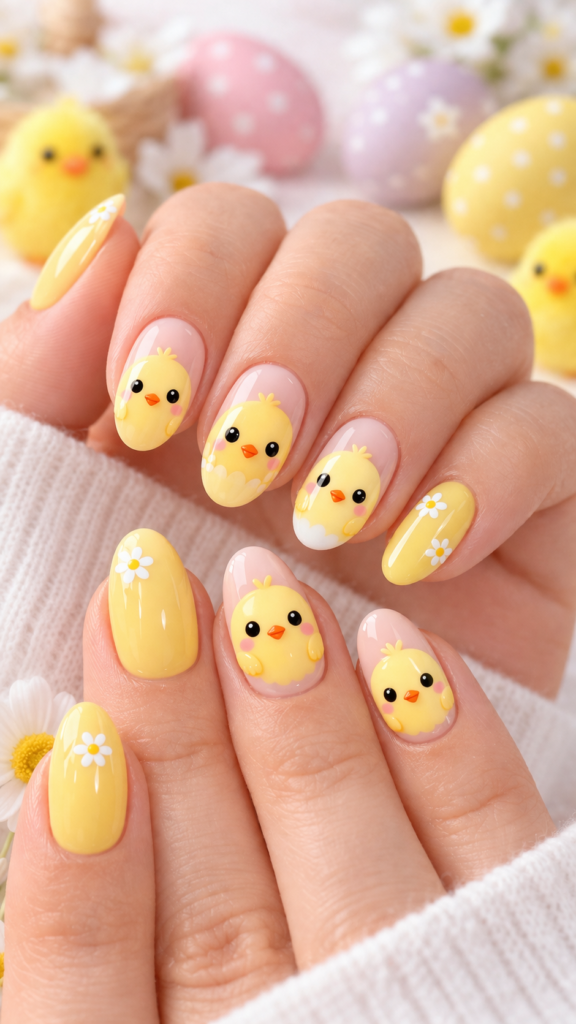 Bright yellow chicks are a classic Easter symbol, making chick nails a fun and playful option. A sunny yellow base combined with tiny chick faces or cracked egg designs creates a joyful and lively manicure. This design is perfect for those who love bold and cheerful styles. You can also mix in white and pastel nails for contrast, creating a balanced look. These cute nails are especially popular among younger audiences and influencers. They’re eye-catching and perfect for festive photos. If you’re looking for something unique yet adorable, this spring manicure idea is worth trying.