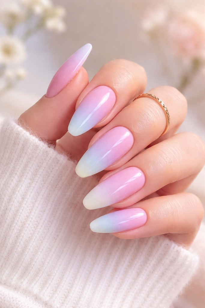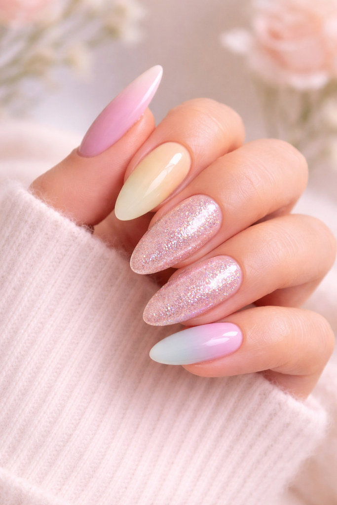 Ombre nails are always in style, and pastel gradients are perfect for Easter. Blending soft shades like pink, blue, and lavender creates a dreamy and seamless transition. This design is both simple and eye-catching, making it ideal for any occasion. You can add glitter or rhinestones for extra sparkle, enhancing the overall effect. Thesetrendy nails are highly लोकप्रिय on social platforms and loved for their versatility. Whether you prefer short or long nails, this look adapts beautifully. It’s a must-have in your collection of spring nail ideas.