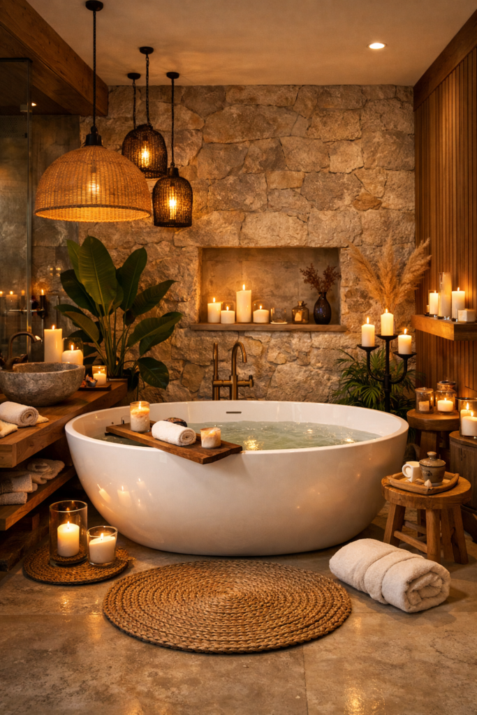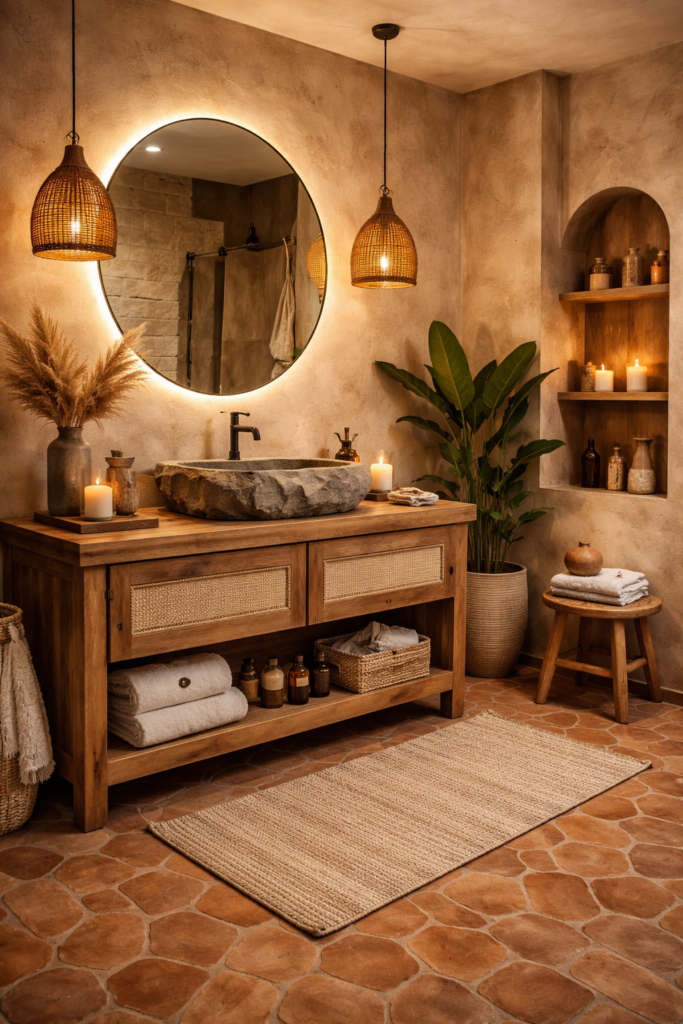Natural materials are a major trend in bathroom design for 2026. Designers are incorporating materials such as stone, wood, clay tiles, and marble to create a warm and organic atmosphere. Earthy color palettes including terracotta, sand, olive green, and warm beige are also gaining popularity. These tones bring a sense of calm and connection to nature. Textured surfaces, such as stone sinks or wooden vanities, add visual interest without overwhelming the space. Combining natural materials with modern fixtures creates a balanced look that feels both contemporary and timeless.