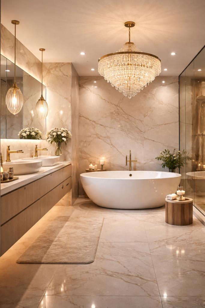 Lighting plays a major role in bathroom design. In 2026, statement lighting fixtures are becoming a focal point in both small and master bathrooms. Pendant lights, sculptural wall sconces, and elegant chandeliers are increasingly used to create visual interest. Layered lighting is another important concept that combines task lighting, ambient lighting, and accent lighting. This approach ensures the bathroom is functional while maintaining a stylish atmosphere. Proper lighting also enhances mirrors, tiles, and textures within the space. Choosing warm light tones can make the bathroom feel cozy and welcoming, especially in larger master bathrooms.