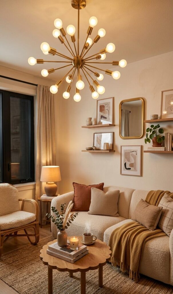 Lighting plays a crucial role in defining the ambiance of an elegant small living room. A statement chandelier, pendant light, or sculptural lamp can instantly upgrade your space. Choose warm lighting tones to create a cozy yet luxurious atmosphere. Layered lighting—combining ambient, task, and accent lighting—adds depth and dimension to the room. This is one of the most effective small living room decor ideas for achieving a high-end look on a budget. Opt for modern or minimalist fixtures that complement your decor theme. Even a small space can feel grand with the right lighting choices.