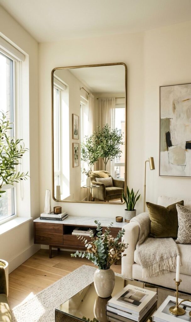 Mirrors are a timeless trick in small living room design ideas to make spaces appear larger and brighter. A large wall mirror or a set of decorative mirrors reflects light and creates an illusion of depth. Choose frames in gold, black, or metallic finishes to maintain a chic home decor style. Placing mirrors opposite windows maximizes natural light and enhances the airy feel of the room. This technique is widely used in modern interior design trends for compact spaces. Mirrors also act as decorative pieces, adding elegance without taking up floor space.