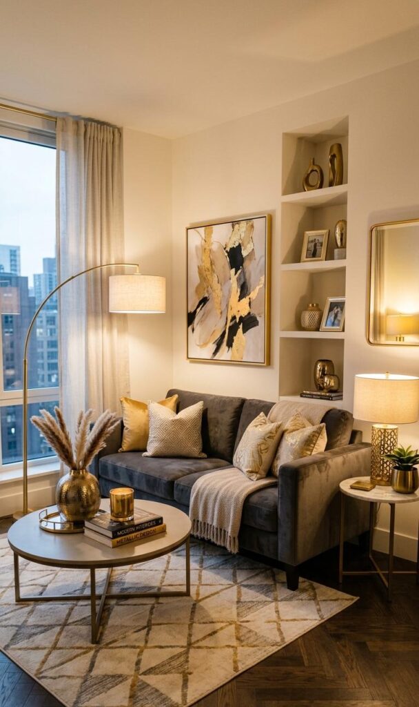 Metallic elements like gold, brass, or chrome can instantly elevate your elegant small living room decor. Use them in light fixtures, table legs, or decorative accessories. These accents add a touch of luxury without overwhelming the space. Keep the balance subtle to maintain sophistication. This trend is widely seen in modern chic home decor styles.