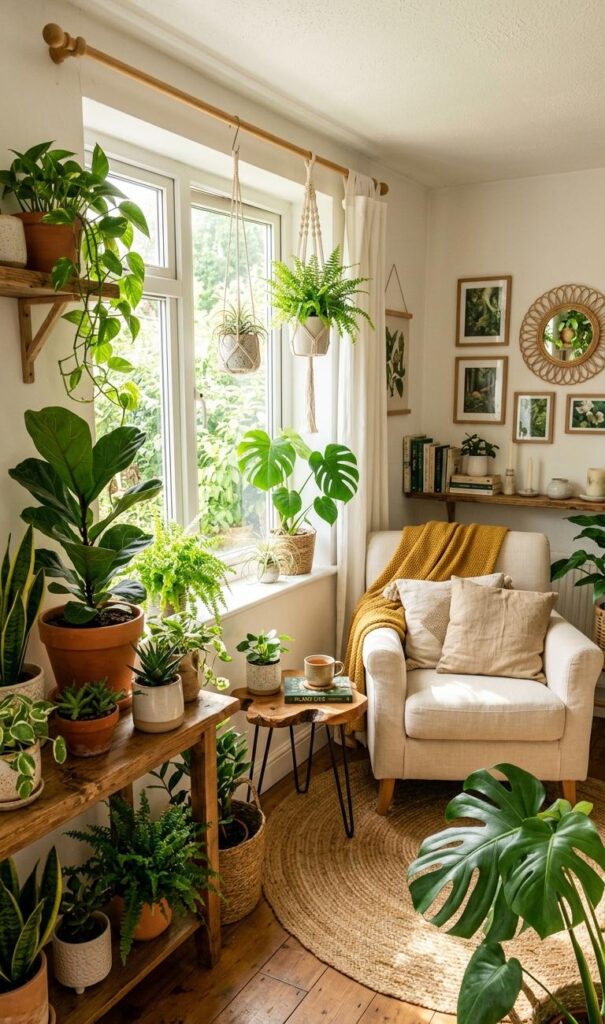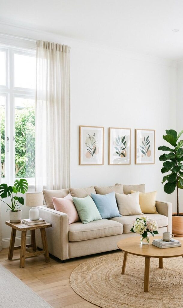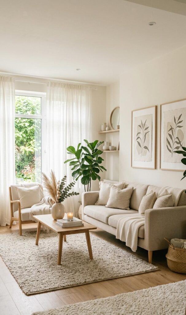 Indoor plants are a fantastic addition to small living room decor ideas for a bright interior. They bring life, color, and freshness to your space without overwhelming it. Choose plants with light green leaves or place them in white or neutral pots to maintain the bright aesthetic. Trending biophilic design ideas emphasize connecting indoor spaces with nature, enhancing both visual appeal and well-being. Position plants near windows to ensure they receive enough light while contributing to the room’s brightness. This simple addition not only improves air quality but also creates a lively and inviting atmosphere, making your living room feel more vibrant and refreshing.