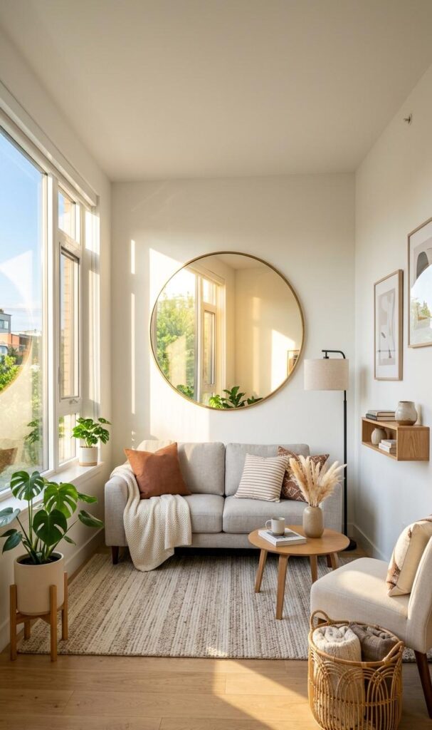 Mirrors are a powerful design trick in small living room decor ideas for a bright interior. By reflecting natural and artificial light, mirrors instantly make a room appear bigger and more luminous. Place a large mirror opposite a window or behind a light source to maximize its effect. Trending styles include round mirrors, minimalist frames, and statement mirror walls that enhance modern interior design trends. Mirrors also add a decorative touch without cluttering the space, making them perfect for compact areas. Whether you choose a single oversized mirror or a gallery of smaller ones, this approach boosts both brightness and visual depth. It’s a simple yet impactful way to transform your living room into a stylish, open, and light-filled environment.