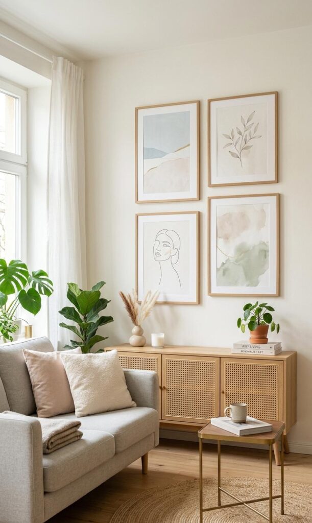 Wall decor can significantly impact the brightness of your living room. Choose artwork and frames in light colors or reflective finishes to complement your bright living room decor ideas. Avoid heavy, dark pieces that can make the space feel smaller. Trending wall decor ideas for small spaces include abstract art, minimalist prints, and floating shelves with light-toned accessories. These elements add personality without overwhelming the room. Keeping wall decor simple and cohesive enhances the overall brightness and maintains a clean aesthetic. By carefully selecting decor that reflects light and aligns with your color palette, you can create a visually appealing and spacious living room that feels both stylish and inviting.