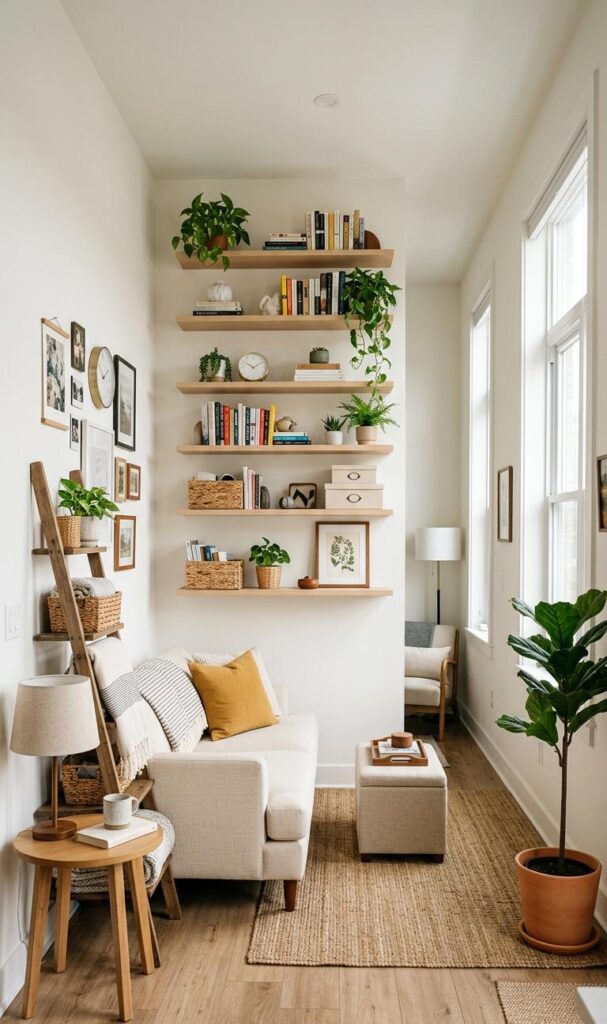 Making use of vertical space is essential for keeping a small living room bright and clutter-free. Install floating shelves or wall-mounted storage to free up floor space and maintain openness. Trending small space storage ideas focus on maximizing functionality without compromising style. Use light-colored shelves and minimal decor items to keep the look clean and airy. This approach ensures that your living room remains organized while allowing light to flow freely. By utilizing vertical space effectively, you create a more spacious and visually appealing environment that aligns perfectly with modern bright interior design trends.