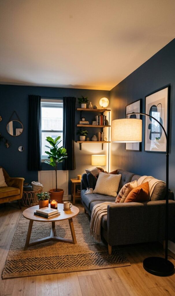 Lighting is essential for creating the perfect ambiance in a small living room. Combine ambient, task, and accent lighting to achieve a balanced look. Use floor lamps, table lamps, or LED strips to highlight different areas of your room. Trending keywords like living room lighting ideas, ambient lighting design, and modern lighting decor emphasize this concept. Warm lighting creates a cozy atmosphere, while brighter lights improve functionality. Avoid relying on a single overhead light source. Instead, layer your lighting to enhance depth and style. Proper lighting c