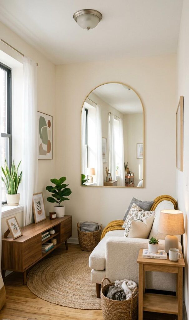Mirrors are a classic trick in small living room decor ideas to make spaces appear larger and brighter. Placing a mirror opposite a window reflects natural light and creates depth. This simple and affordable decor hack can instantly transform your room. Choose stylish frames to match your interior theme without spending too much. Even a large floor mirror can act as a statement piece. Mirrors not only enhance lighting but also elevate the overall aesthetic. This budget-friendly solution is perfect for making your living room feel open and inviting.
