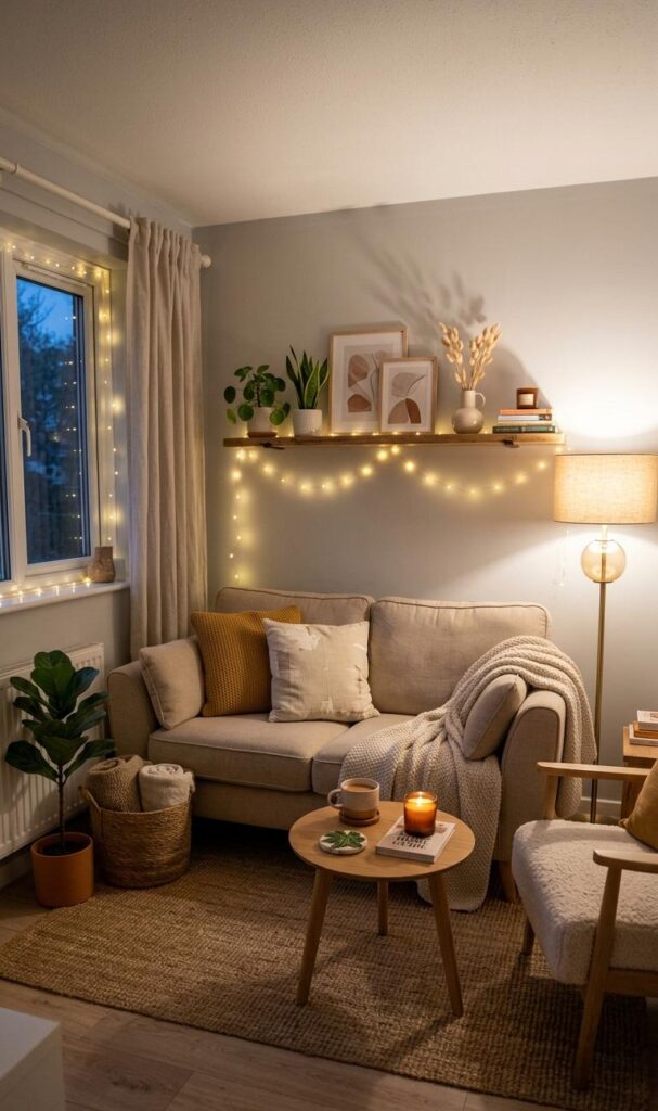 Lighting plays a huge role in affordable living room decor. Swap out harsh lighting for soft, warm lights to create a cozy atmosphere. String lights, floor lamps, or LED strips are budget-friendly options that instantly upgrade your space. Layering different light sources adds depth and comfort to your room. You don’t need expensive fixtures—simple lighting changes can make a big difference. Proper lighting enhances mood and highlights your decor beautifully. This is one of the easiest ways to elevate your small living room without spending much.