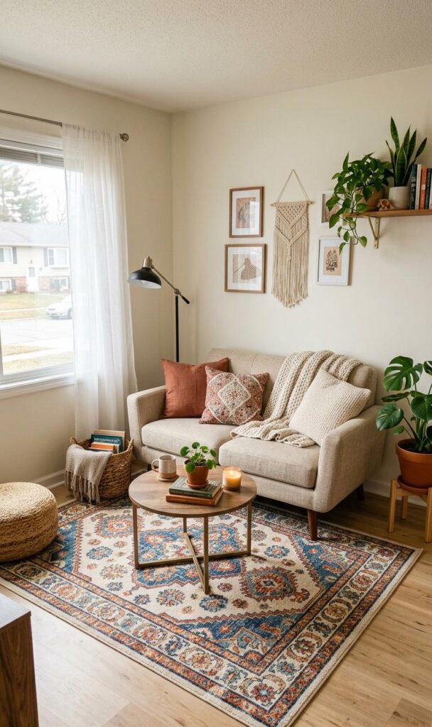 Rugs are essential in small living room ideas on a budget because they help define areas and add warmth. A well-chosen rug can make your room feel larger and more cohesive. Opt for neutral or patterned rugs that complement your furniture. Affordable options are widely available and can instantly transform your space. Place your furniture partially on the rug to create a unified look. Rugs also add texture and comfort, making your living room more inviting. This simple addition can significantly enhance your decor without breaking the bank.