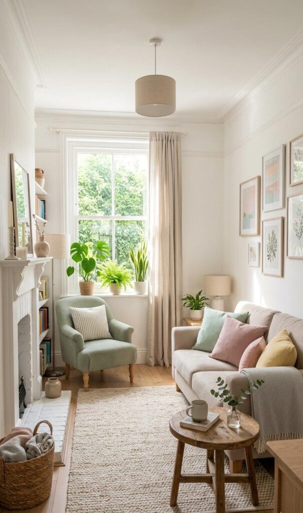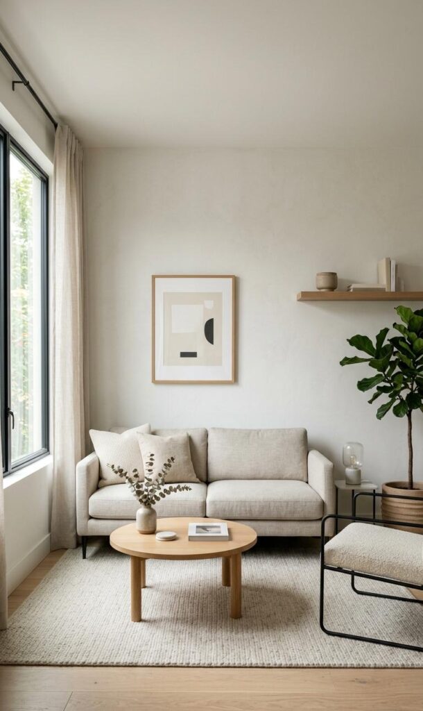 Color selection is vital in small living room decor ideas that aim to feel fresh. Light shades like white, beige, and pastels create an open and airy environment. Trending keywords include light color interiors, airy living room design, and modern neutral decor. These tones reflect light, making the room appear larger and brighter. You can add subtle contrasts with soft textures or muted accents. Avoid dark, heavy colors that can make the space feel cramped. A fresh palette promotes relaxation and clarity, making your living room more welcoming. This simple yet effective strategy ensures your space feels modern, clean, and effortlessly stylish without requiring major renovations or expenses.