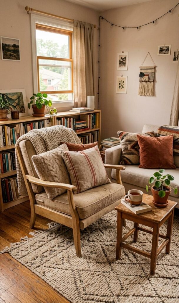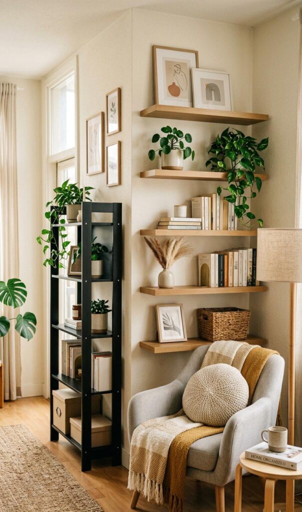 Vertical storage is key in small living room decor ideas that feel fresh and organized. Install floating shelves or tall bookcases to maximize wall space. Trending keywords include vertical storage ideas, small space organization, and modern shelving decor. These solutions keep your floor clear while providing storage and display areas. Decorate shelves with books, plants, and minimal accessories for a balanced look. This approach adds visual interest without cluttering the room. Utilizing vertical space helps maintain a clean and structured environment, making your living room feel more spacious and thoughtfully designed. It’s a practical yet stylish way to enhance both functionality and aesthetics.