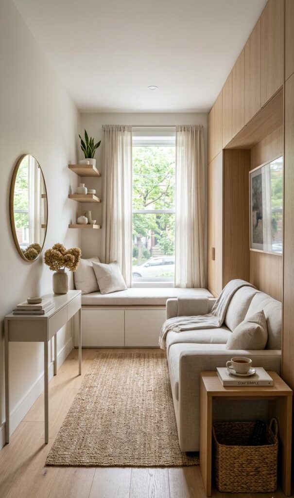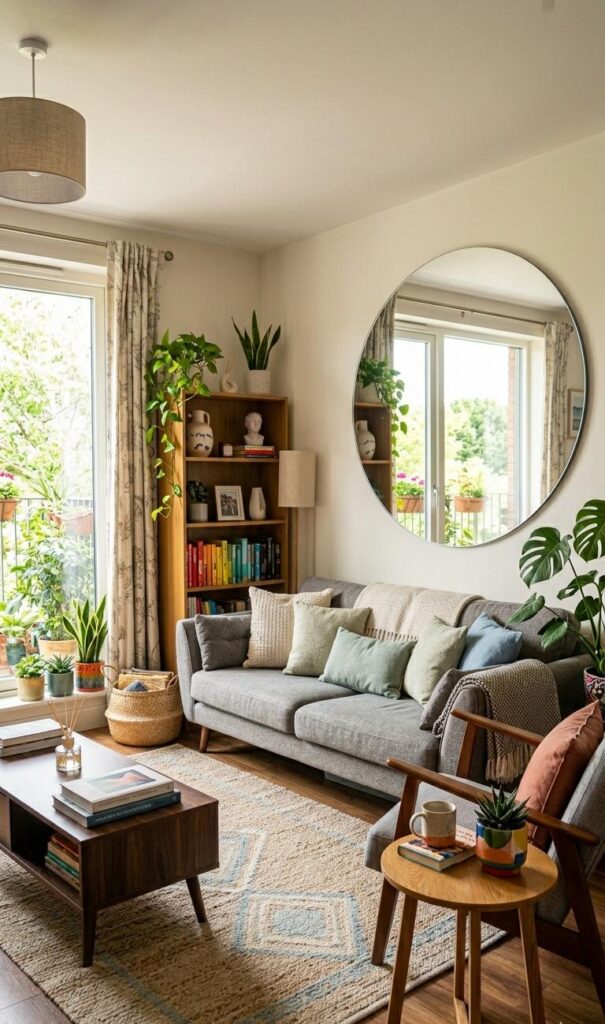 Mirrors are a timeless trick in small living room decor that make spaces feel fresh and expansive. Position a large mirror opposite a window to reflect natural light and visually double the room size. Trending keywords like mirror decor ideas, small space hacks, and light-enhancing interiors emphasize this strategy. Frameless or metallic-framed mirrors add a modern touch while enhancing brightness. This technique not only improves lighting but also adds elegance. A well-placed mirror can transform a cramped area into a more open and inviting environment. It’s an affordable and stylish solution that works in almost any design theme, from contemporary to classic, helping your living room feel brighter, bigger, and more refreshing instantly.