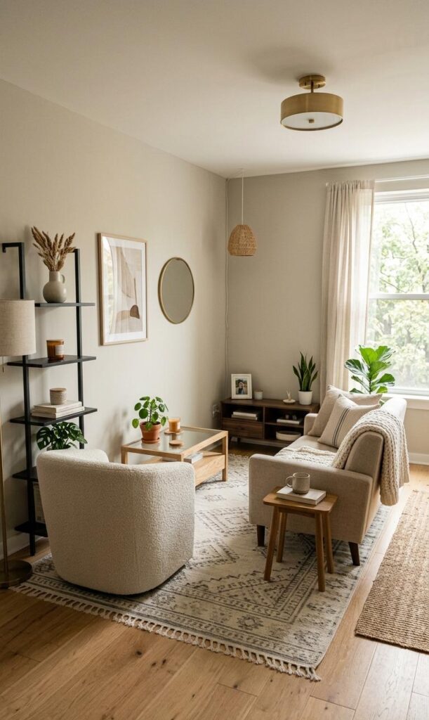 Rugs can help define different areas within a small living room while adding texture and warmth. Choose a rug that fits your seating arrangement without overwhelming the space. Light-colored or patterned rugs can create visual interest. Using area rug ideas, small living room styling, and cozy decor trends enhances the overall design. Ensure the rug complements your furniture and color scheme. A well-placed rug anchors the room and makes it feel complete. Avoid overly large or dark rugs, as they can make the space feel smaller. Instead, opt for subtle designs that enhance openness.