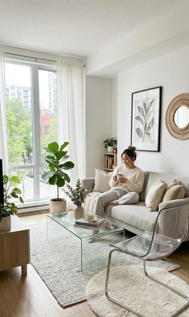 Transparent furniture, such as glass tables or acrylic chairs, creates the illusion of more space. These pieces take up less visual weight, making the room feel open and airy. Incorporating transparent furniture ideas, modern small space decor, and minimalist design trends helps maintain a sleek look. Glass coffee tables or clear chairs blend seamlessly with any style. They are perfect for maintaining functionality without cluttering the visual space. This design trick is especially useful in compact living rooms where every detail matters.