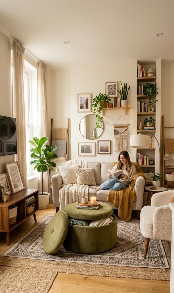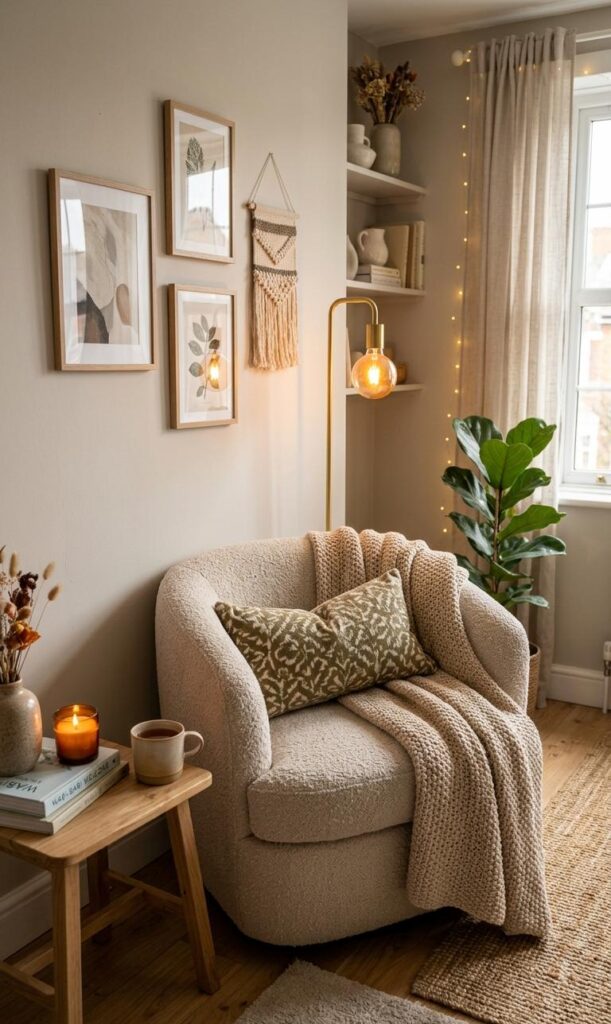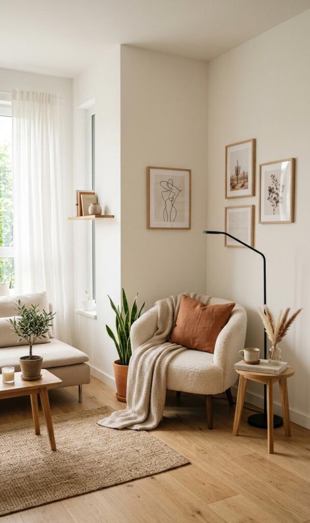 A well-designed cozy corner starts with the right seating, and a compact armchair is a perfect choice for small spaces. Opt for a plush chair with soft upholstery that instantly enhances small living room decor ideas while maintaining comfort. Position it near a window or beside a floor lamp to create a relaxing reading nook. Add a soft throw blanket and a textured cushion to elevate the cozy living room aesthetic. Neutral tones or warm hues like beige, cream, or soft brown work beautifully in compact spaces. This setup not only maximizes functionality but also adds personality to your home. Keeping the design minimal yet inviting helps maintain an uncluttered feel, which is essential for small rooms.