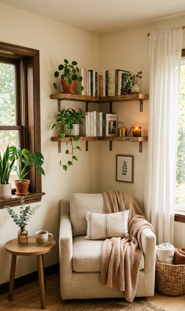 Corner shelving is a smart solution for small living room storage ideas while enhancing your cozy setup. Floating shelves or compact corner units allow you to display books, plants, and decor items without taking up valuable floor space. This helps maintain a clutter-free environment while adding visual interest to your cozy corner. Incorporate small decorative pieces like candles or framed photos to create a personalized touch. Keeping the shelves organized ensures your living room remains functional and stylish. This idea is especially useful for maximizing vertical space in smaller homes. By blending storage with decor, you achieve a balance between practicality and aesthetics.