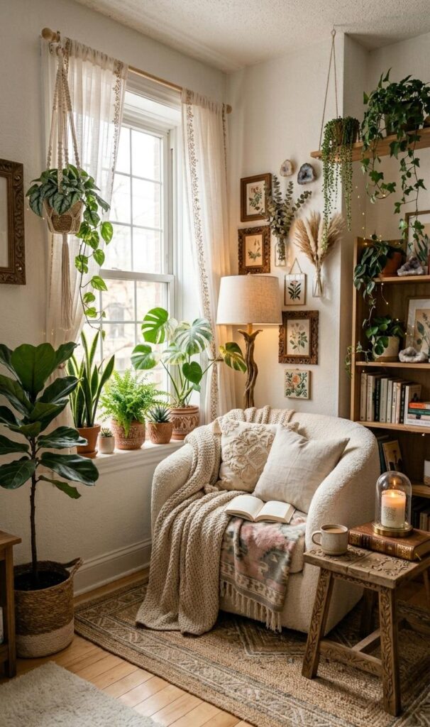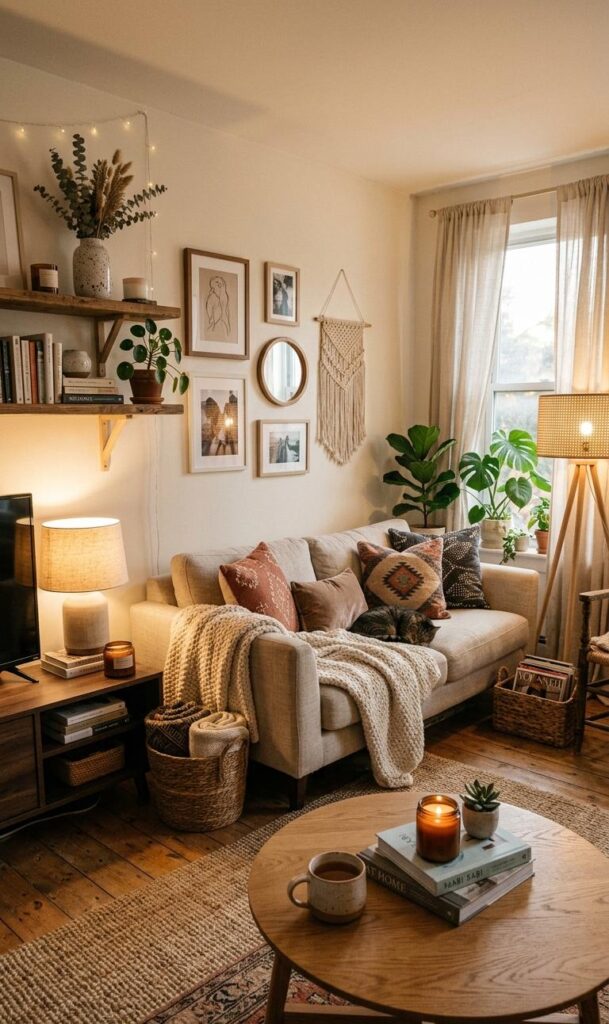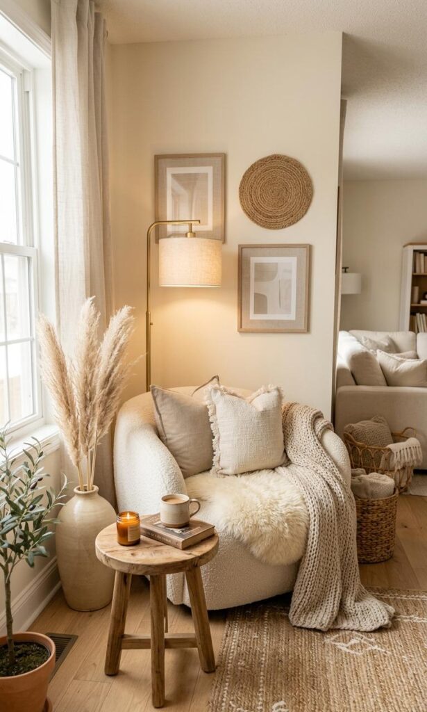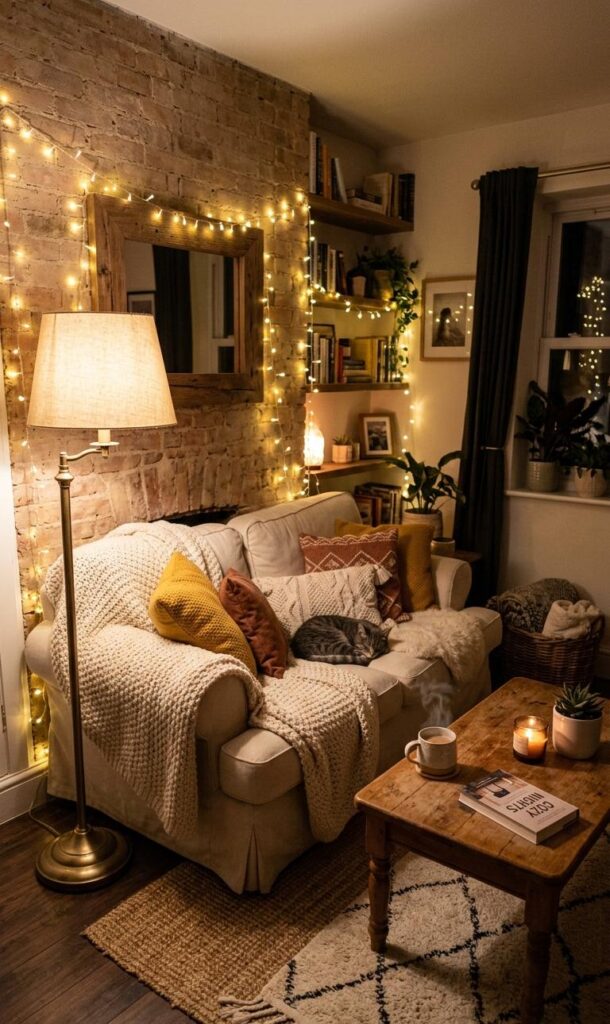 Lighting plays a crucial role in creating cozy living room corners. Soft, warm lighting from table lamps, floor lamps, or fairy lights can instantly transform your space into a relaxing haven. Avoid harsh overhead lighting and instead focus on layered lighting techniques. A stylish floor lamp placed next to your seating area creates a perfect reading nook. Warm-toned bulbs enhance the cozy home decor vibe while making the room feel more inviting. You can also incorporate candles or LED lights for a subtle glow. Proper lighting not only improves functionality but also elevates the overall aesthetic of your living room. This simple addition can make a significant difference in small spaces.