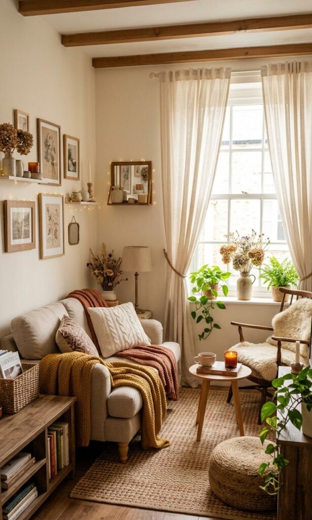 Curtains play an important role in small living room styling ideas. Soft, flowing curtains add warmth and elegance to your cozy corner. Choose light fabrics that allow natural light to filter through while maintaining privacy. Neutral or pastel shades work best for creating a calm atmosphere. Curtains also help define your space and add a layer of texture. This simple addition can make your living room feel more complete and inviting.