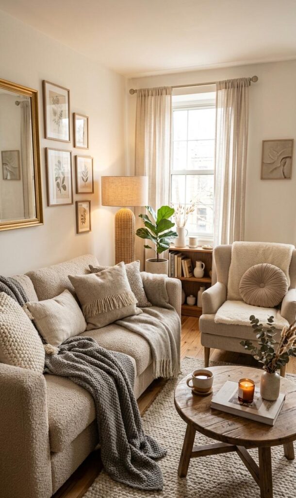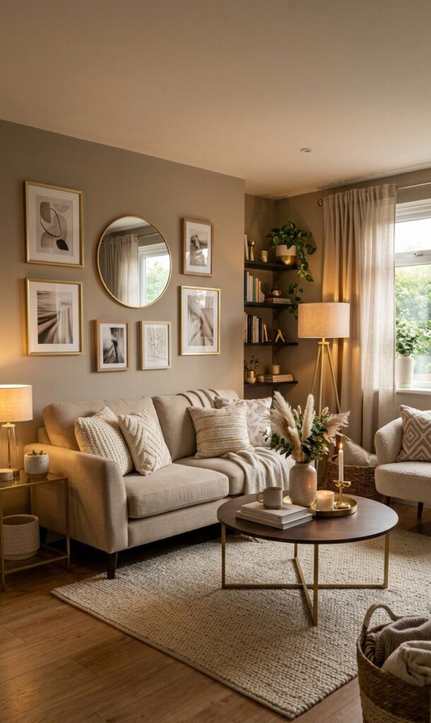 Choosing a neutral color palette is one of the most effective small living room decor ideas for achieving elegance. Shades like cream, taupe, and soft gray create a serene and spacious feel. To elevate the look, incorporate luxe accents such as gold or brass in light fixtures, frames, or decorative items. This combination is a top trend in elegant home decor 2026, offering both simplicity and sophistication. Add soft textures like velvet cushions or a plush throw to enhance comfort. The contrast between neutral tones and metallic finishes creates visual depth while maintaining harmony. This approach ensures your small living room feels stylish yet inviting.