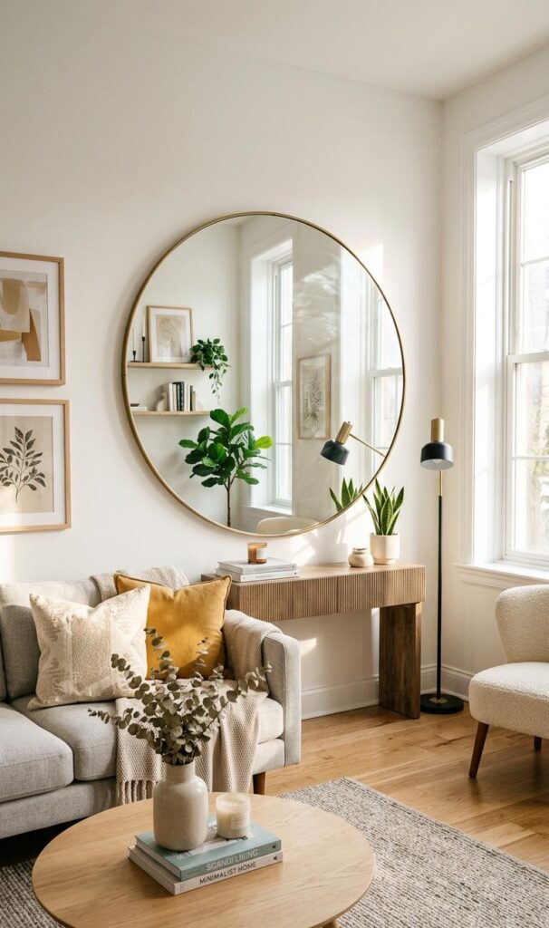 Mirrors are a powerful tool in small space decorating ideas. Strategically placing a large mirror can make your living room appear twice its size by reflecting light and creating depth. Position mirrors opposite windows to maximize natural light and brighten the entire space. This trick is widely used in modern interior design trends for compact homes. Choose elegant frames that complement your decor style, whether it’s minimalist, classic, or contemporary. Mirrors not only enhance visual space but also add a decorative element that feels luxurious. Incorporating this idea instantly upgrades your small living room into a more open and sophisticated setting.