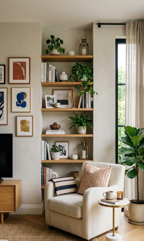 Making use of vertical space is a smart strategy in small living room organization ideas. Install floating shelves or tall bookcases to store items without taking up floor space. This approach not only increases storage but also draws the eye upward, making the room feel taller. Decorate shelves with a mix of books, plants, and decorative objects for a balanced look. This trend is popular in modern small apartment decor, where maximizing space is key. Keep the arrangement neat and symmetrical to maintain elegance. Vertical storage solutions help create a clutter-free environment while adding a stylish dimension to your living room.