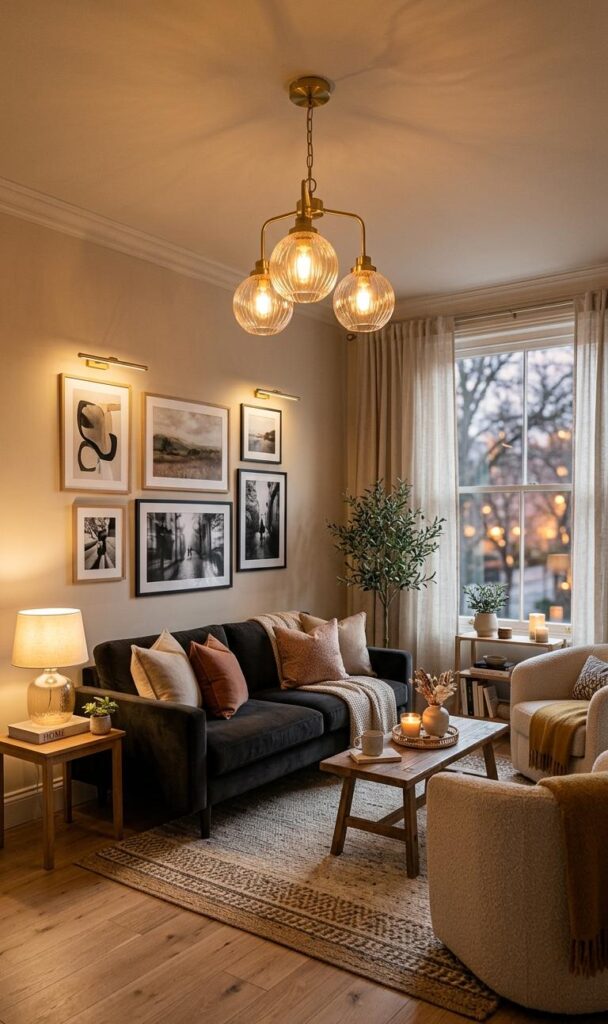 Lighting plays a crucial role in defining the ambiance of a small living room design. A statement light fixture, such as a mini chandelier or pendant light, can instantly elevate the room’s elegance. Combine ambient, task, and accent lighting for a layered effect that enhances depth and warmth. This concept is trending in luxury small living room decor, where lighting doubles as a design element. Opt for warm light tones to create a cozy yet sophisticated atmosphere. Proper lighting highlights key features and adds a touch of glamour, making even the smallest spaces feel upscale and inviting.