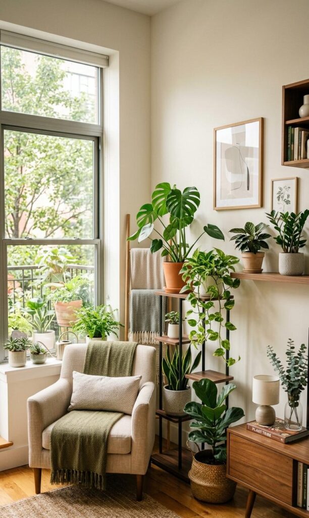 Indoor plants are a simple yet effective way to enhance small living room aesthetics. They bring life, color, and freshness into the space while improving air quality. Popular choices like snake plants, pothos, and fiddle leaf figs are perfect for compact areas. This trend is thriving in biophilic interior design, which connects indoor spaces with nature. Place plants on shelves, corners, or window sills to maximize impact without cluttering. The natural greenery contrasts beautifully with neutral tones, adding vibrancy and elegance. Incorporating plants creates a refreshing and harmonious living environment.