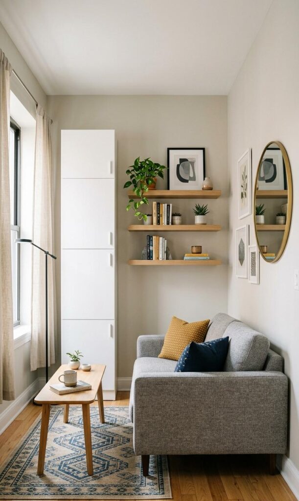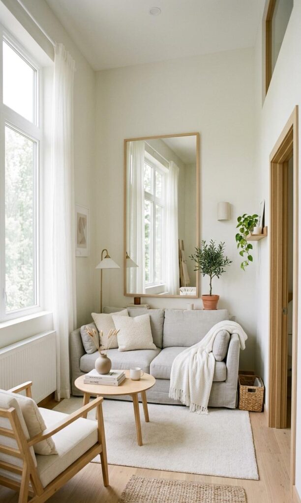 Using light colors and mirrors is a classic trick in small living room decor ideas. Soft shades like white, beige, and pastel tones reflect light, making the room feel larger and brighter. Mirrors amplify natural light and create the illusion of depth. Placing a large mirror opposite a window enhances brightness and openness. Functional decor isn’t just about storage—it also involves visual techniques that improve space perception. Pair light walls with minimal furniture for a clean look. Adding reflective surfaces like glass tables further enhances the effect. This approach creates a welcoming and airy environment, perfect for compact spaces. By combining color and light strategically, you can transform your small living room into a spacious and stylish retreat.