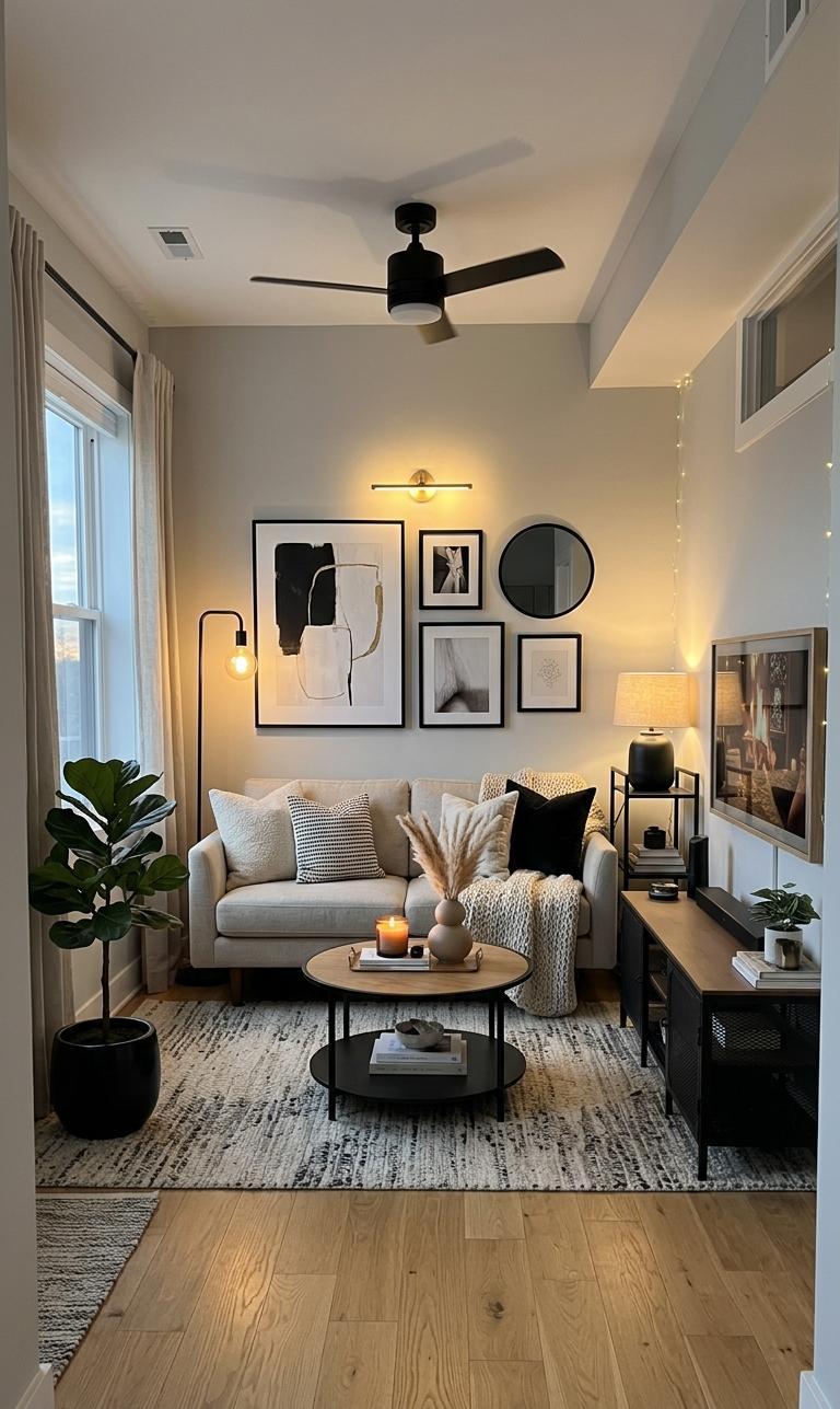 Lighting can dramatically enhance small living room modern layouts. Statement lighting fixtures like pendant lights, floor lamps, or LED strips add both functionality and style. Choose lighting that complements your decor while providing sufficient illumination. Layered lighting, including ambient, task, and accent lighting, creates depth and warmth. Modern fixtures often feature geometric designs or metallic finishes, adding a touch of sophistication. Proper lighting also makes the room feel larger and more inviting. By incorporating stylish lighting elements, you can elevate the overall look of your small living room while maintaining a cozy and contemporary atmosphere.