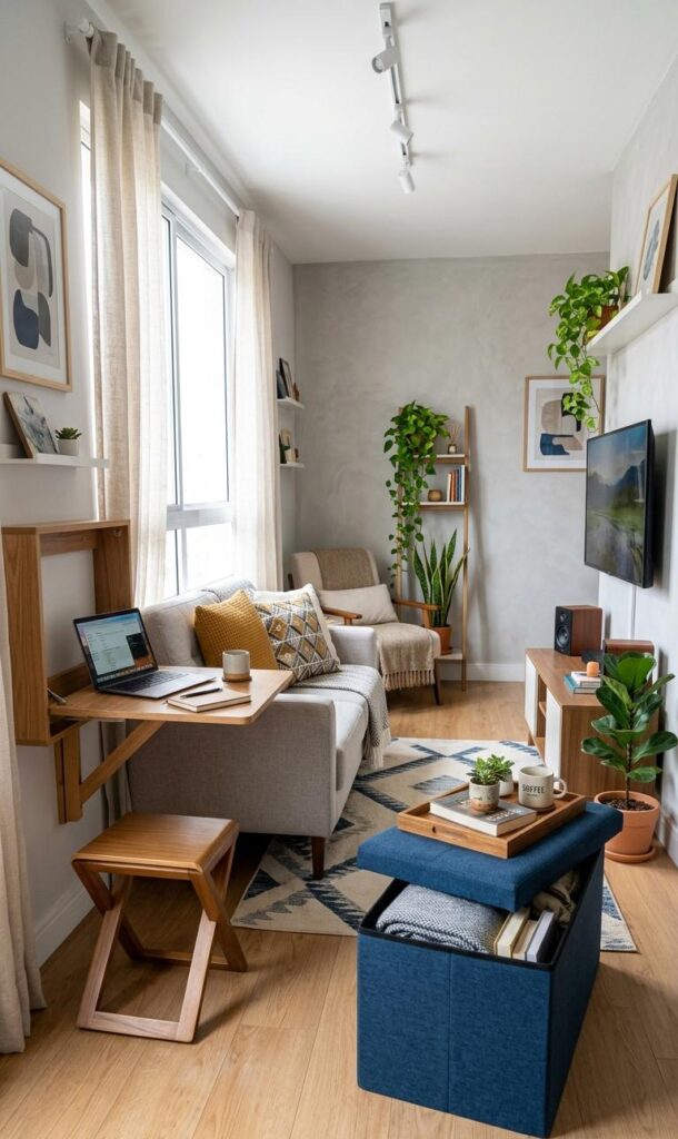 One of the most practical small living room decor ideas with modern layouts is using multi-functional furniture. Pieces like storage ottomans, sofa beds, and nesting tables serve multiple purposes while saving valuable space. In compact homes, every piece should offer both style and function. A coffee table with hidden storage can reduce clutter, while a foldable desk can transform your living room into a workspace when needed. Modern designs focus on efficiency without sacrificing aesthetics, making these pieces both practical and visually appealing. Investing in multifunctional furniture allows you to maximize usability while maintaining a clean and organized look. This approach is especially useful for apartments and small homes where space is limited but style remains a priority.
