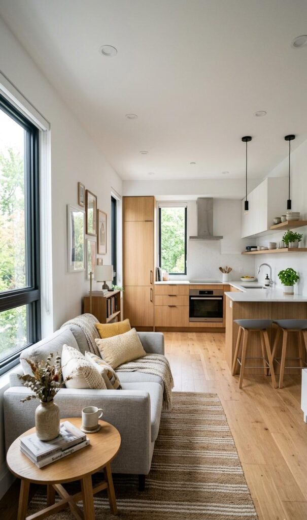 Open layouts are a popular trend in modern small living room ideas. By removing unnecessary partitions, you can create a seamless flow between spaces like the living room, dining area, and kitchen. This design approach makes small spaces feel larger and more connected. Use rugs or furniture placement to subtly define different zones without blocking the visual flow. Keeping the color scheme consistent across areas enhances cohesion and unity. Open layouts also allow natural light to travel freely, making the space feel brighter and more welcoming. Incorporating this concept into your small living room design ensures a spacious and modern atmosphere that feels both functional and visually appealing.