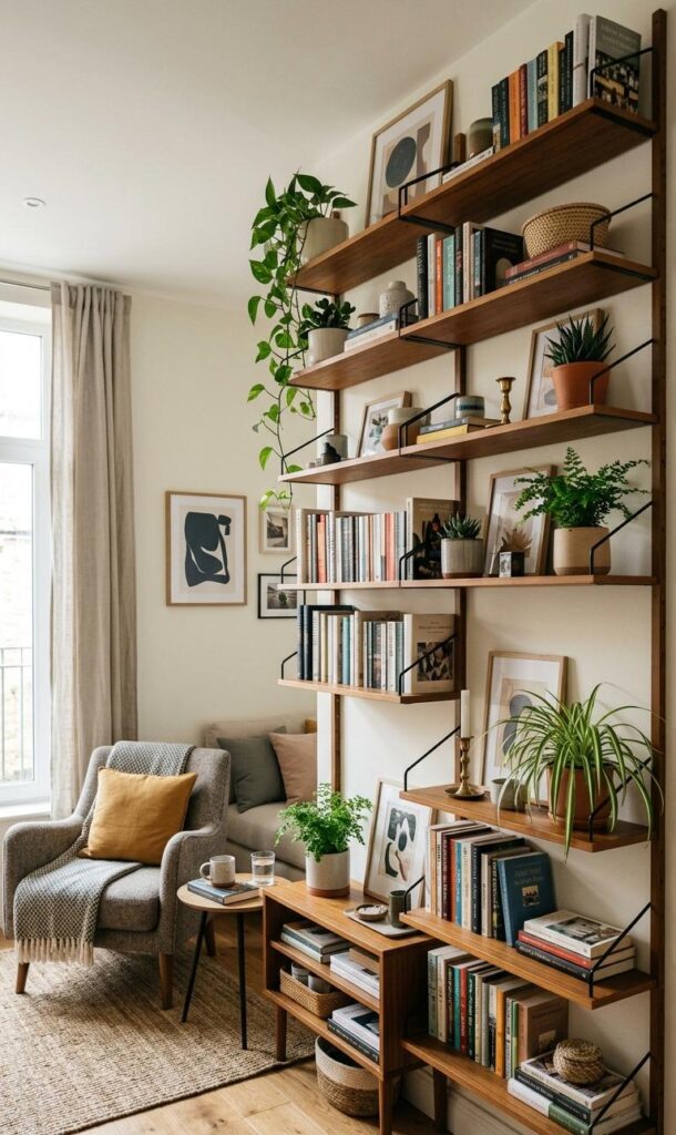 Maximizing vertical space is essential in small living room decor ideas. Wall-mounted shelves, tall cabinets, and floating units help keep the floor area free while providing ample storage. Vertical storage draws the eye upward, making the room appear taller and more spacious. Modern designs often feature sleek, minimal shelving that blends seamlessly with the decor. Use these shelves to display books, plants, or decorative items without overcrowding the room. Keeping storage organized ensures a clean and clutter-free environment. This strategy is perfect for maintaining both functionality and style in compact living spaces, allowing you to enjoy a modern layout without sacrificing storage needs.