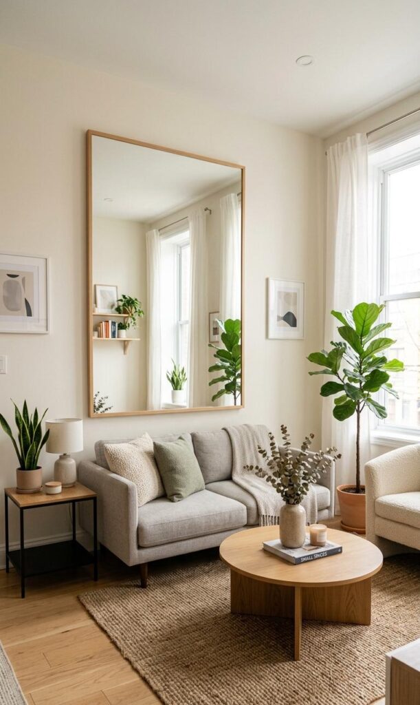 Mirrors are a powerful tool in small living room decor ideas with modern layouts. Placing a large mirror opposite a window reflects light and creates the illusion of a bigger space. Mirrors also add elegance and serve as decorative elements. Choose frameless or minimalist designs for a modern look. Strategically placing mirrors can enhance both natural and artificial lighting, making the room feel brighter. This simple yet effective technique is widely used in modern interiors to maximize visual space. Incorporating mirrors into your decor ensures your small living room feels open, stylish, and well-balanced.