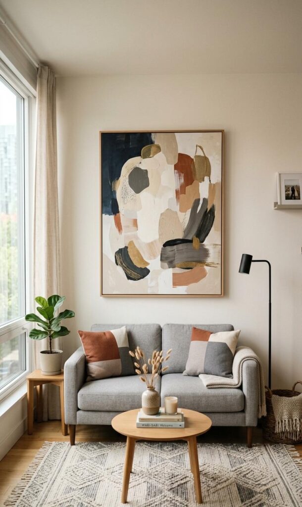 Wall decor plays an important role in small living room decor ideas. Instead of overcrowding walls with multiple items, choose a few statement pieces like abstract art or framed prints. Modern designs focus on simplicity and impact. Large artwork can act as a focal point, adding personality without clutter. You can also use wall-mounted decor like floating frames or metal art for a contemporary touch. Keeping wall decor minimal ensures the space feels open and organized. This approach enhances the overall aesthetic while maintaining a clean and modern vibe in your small living room.
