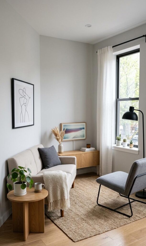 Color selection plays a vital role in small living room modern design ideas. Neutral palettes such as whites, creams, and soft greys make a room feel more open and airy. To prevent the space from looking dull, incorporate modern accents like black metal frames, bold cushions, or abstract art. These elements add contrast and personality without overwhelming the space. Light-colored walls reflect natural light, enhancing brightness and creating a spacious feel. You can also introduce texture through rugs, throws, and cushions to add depth. By combining neutral tones with subtle modern accents, you create a balanced design that feels both contemporary and inviting. This approach is ideal for small living rooms aiming for a sleek yet cozy aesthetic.
