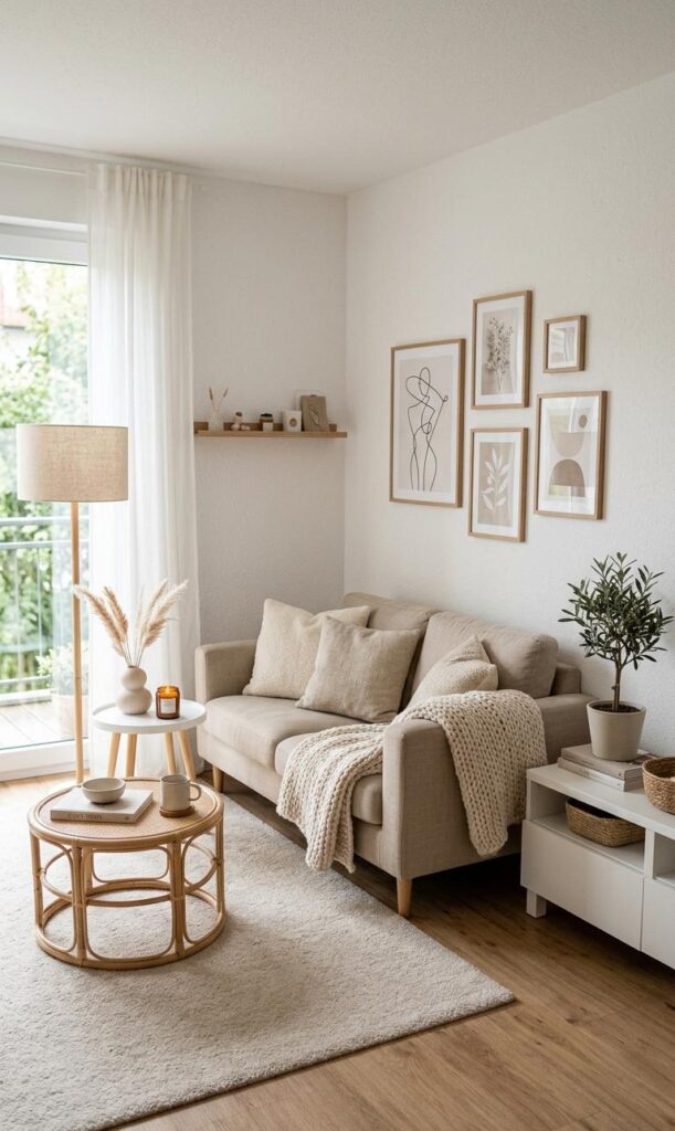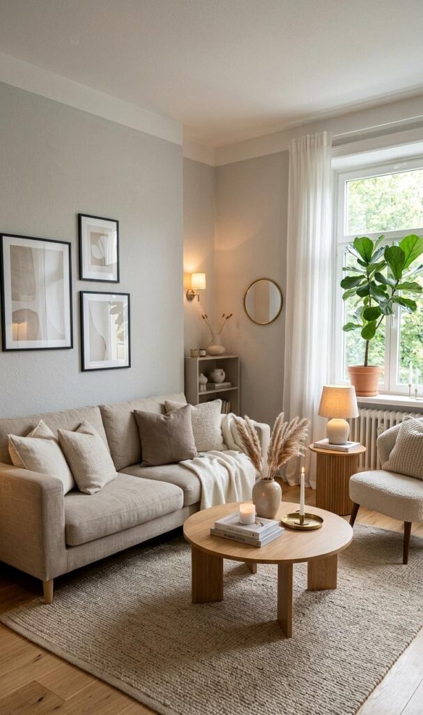 In a neutral small living room, less is truly more. Avoid overcrowding your space with too many decorations. Instead, choose a few meaningful pieces like candles, books, or a statement vase. This approach aligns with minimalist decor trends, which focus on simplicity and functionality. Keeping decor intentional helps maintain a clean and organized look. Neutral tones enhance this effect by creating a cohesive and calming atmosphere. This style is highly लोकप्रिय in modern living room ideas, especially for small spaces. By reducing visual clutter, you allow each piece to stand out. The result is a serene, elegant environment that feels both stylish and comfortable, perfect for everyday living.