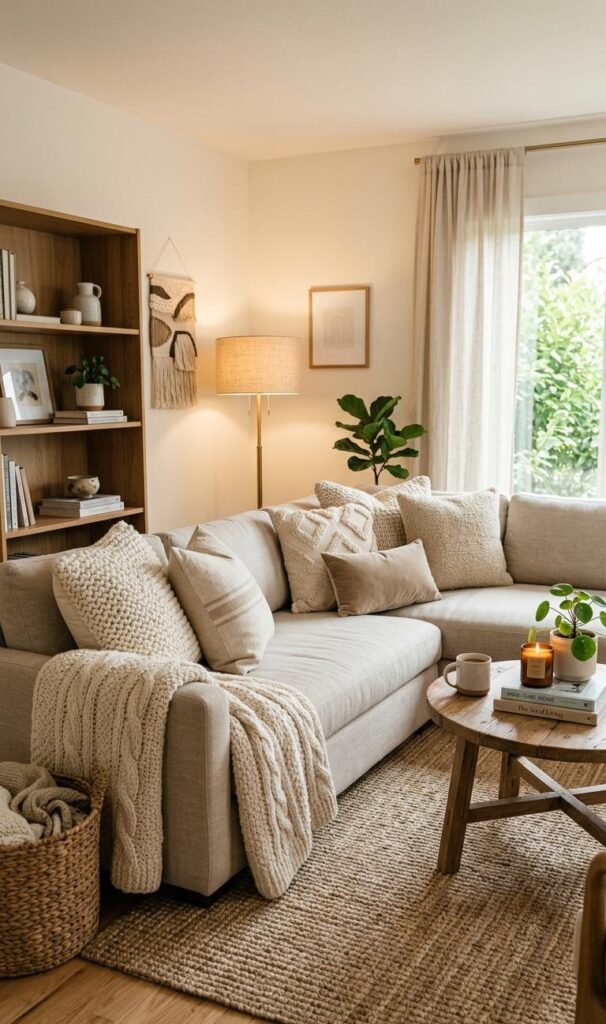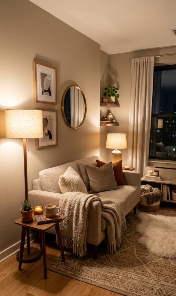 Lighting plays a crucial role in small living room decor ideas. Soft, warm lighting can transform a neutral space into a cozy retreat. Use table lamps, floor lamps, or string lights to create a layered lighting effect. This enhances the warmth of neutral tones, making the room feel inviting. Avoid harsh overhead lighting, as it can make the space feel cold. This trend is popular in cozy home decor inspiration, especially for small apartments. Warm lighting complements beige, cream, and gray tones beautifully. It also highlights textures and decor elements, adding depth to the room. The right lighting can elevate your space, making it feel both stylish and comfortable