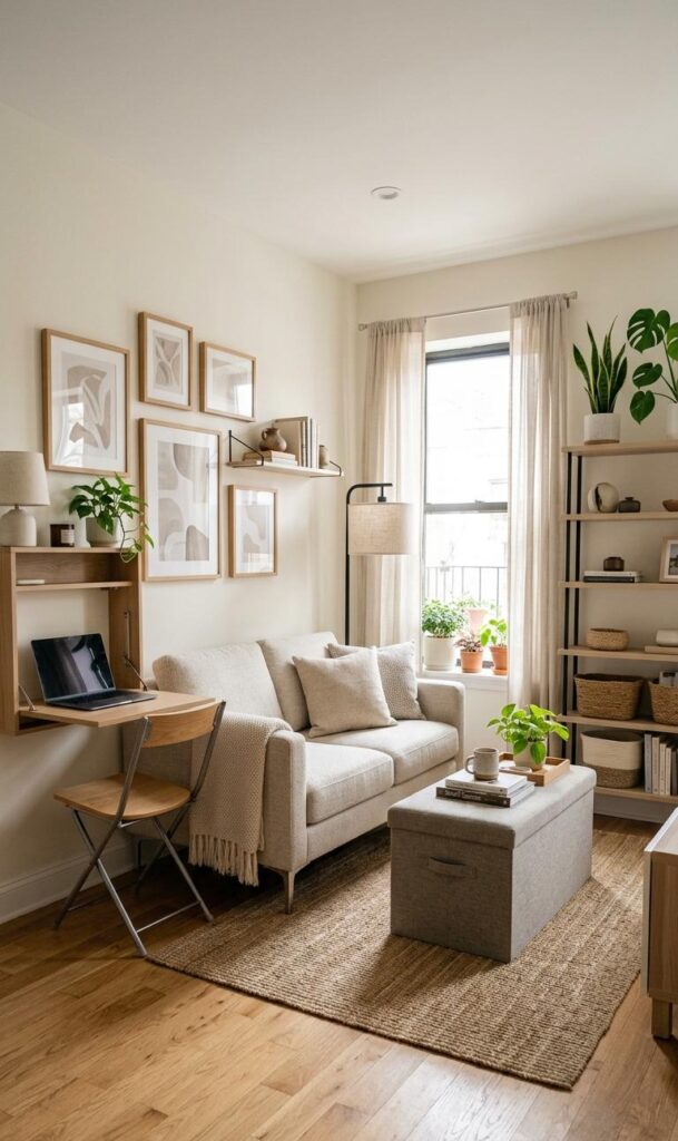 In a small living room setup, every piece of furniture should serve a purpose. Opt for multi-functional furniture like storage ottomans, foldable tables, or sofas with hidden compartments. These pieces help maximize space while maintaining a clean, neutral aesthetic. Neutral-colored furniture blends seamlessly into the room, making it appear less crowded. This is especially important for small space decorating ideas where efficiency matters. A light-colored sofa paired with a sleek coffee table can create a sophisticated yet practical look. This trend is widely लोकप्रिय in modern interior design, as it combines functionality with style. By choosing versatile furniture, you can keep your living room organized, spacious, and visually appealing without compromising comfort or elegance.