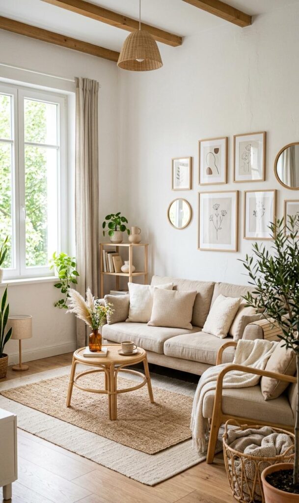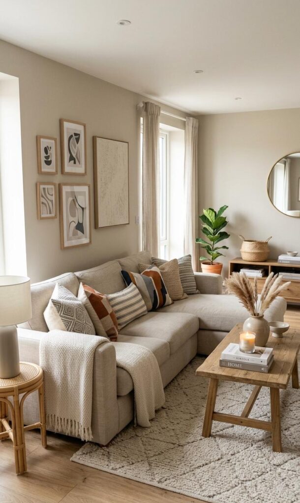 Mirrors are a powerful tool in small living room design. They reflect light and create the illusion of a larger space. A large mirror placed strategically can make your room feel more open and airy. This is a popular trick in modern neutral decor ideas. Choose a simple frame that complements your neutral palette. Mirrors also add a touch of elegance without overwhelming the space. This technique is widely used in small apartment decorating ideas to maximize visual space. Pairing mirrors with light-colored walls enhances their effect. The result is a bright, spacious living room that feels both stylish and functional, perfect for modern living.