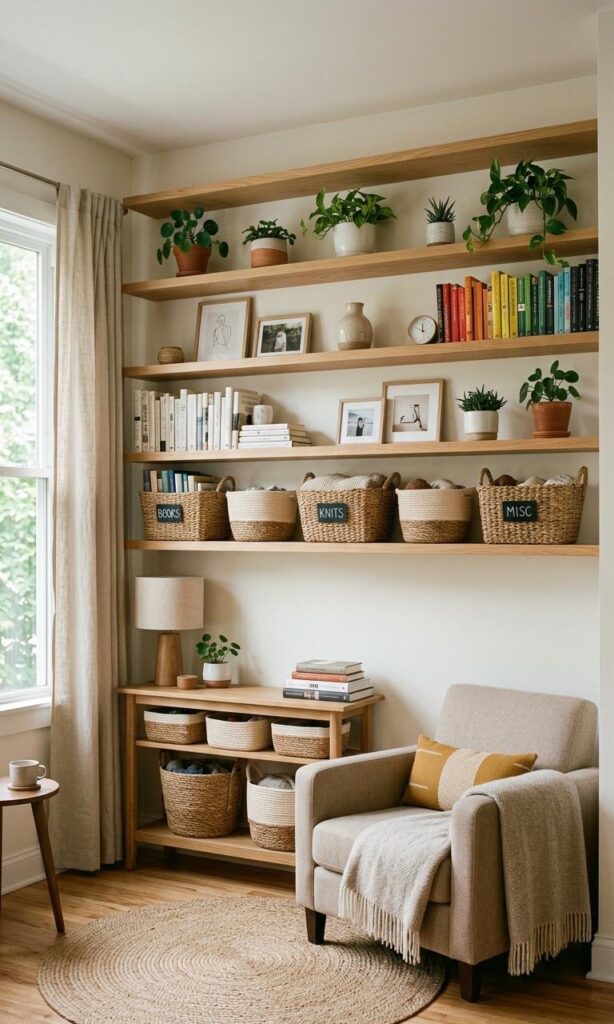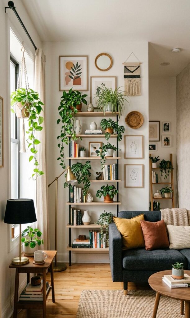 When floor space is limited, think vertically. Vertical decor ideas like tall bookshelves, hanging plants, and wall art can add personality without crowding the room. This approach draws the eye upward, making the ceiling appear higher and the room feel bigger. Use floating shelves to display books, décor, or plants in a stylish way. Vertical storage also keeps your floor area open, enhancing movement and functionality. This small living room design hack is perfect for maximizing every inch of space while maintaining a clean and organized look.