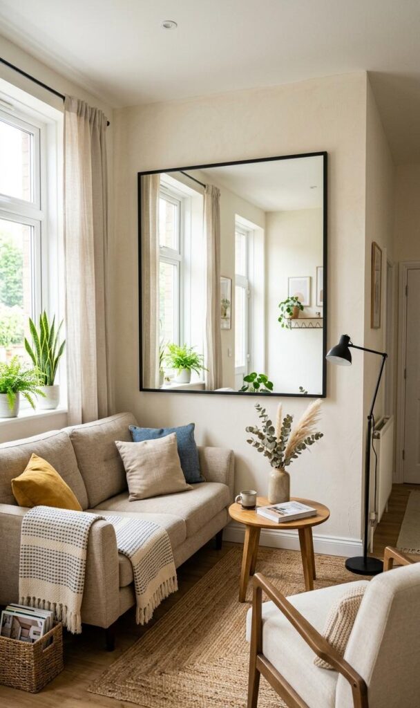 Mirrors are one of the most effective small living room hacks. Strategically placing mirrors can reflect light and create the illusion of a larger room. Position a large mirror opposite a window to maximize natural light and brighten your space. Decorative mirrors can also serve as stylish focal points while enhancing depth. This smart design trick works especially well in compact apartments where space is limited. Choose frames that complement your décor style, whether modern, boho, or minimalist. Mirrors not only improve aesthetics but also make your living room feel more spacious and inviting.